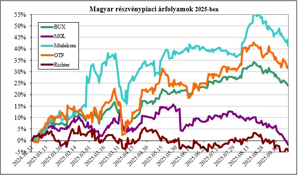 A vezető magyar részvények teljesítménye erős szórást mutat. Mindegyik részvény egy külön történet, az Mtelekom és az OTP nagyot erősödött, míg a MOL-nak és a Richternek az értéke alacsonyabb, mint év elején.